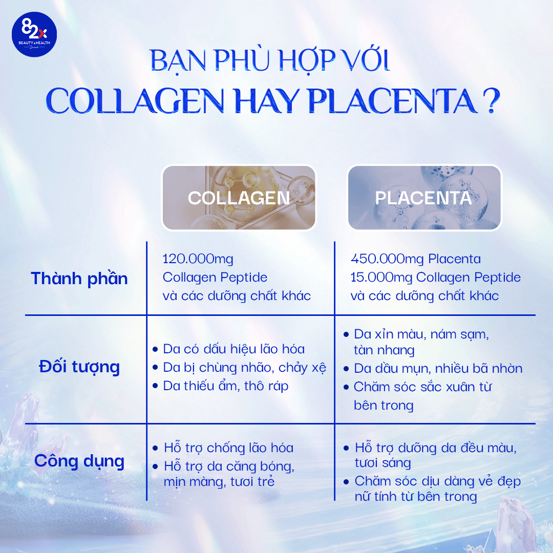 Thực Phẩm Bảo Vệ Sức Khoẻ Placenta 82X 450000 Classic dành cho phụ nữ, đang gặp tình trạng da lão hoá như da khô sạm, da nhăn, kém đàn hồi, người có nhu cầu chăm sóc làn da đẹp, sản phẩm giúp bù đắp lượng collagen sụt giảm và góp phần thúc đẩy tăng sinh collagen tự nhiên trong cơ thể.